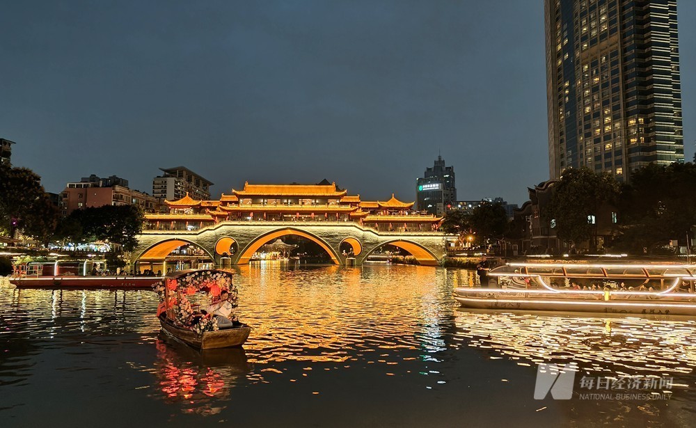 进入9月,成都逐渐褪去炎热,夜幕降临之际,游船在波光粼粼的锦江上前行,带领游客们感受这座内陆城市水岸一体的活力。